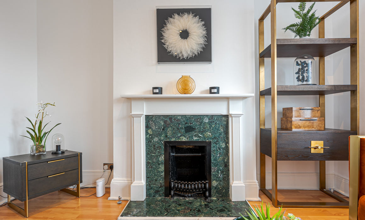 Upon entering, you’ll be greeted by a large reception room with an ornate fireplace and a Juliet balcony, perfect for enjoying a morning coffee or a glass of wine in the evening.